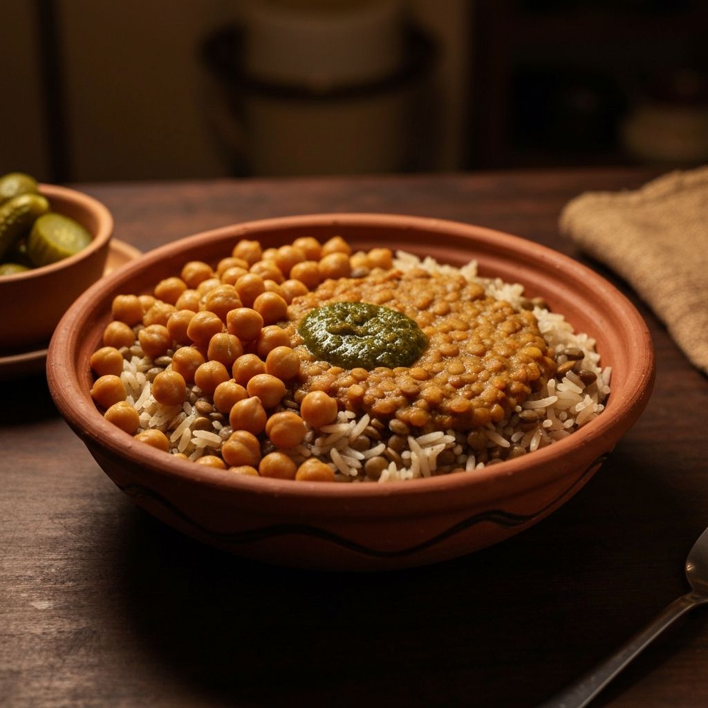 - • Koshary - Mixed rice, lentils, and pasta with sauce